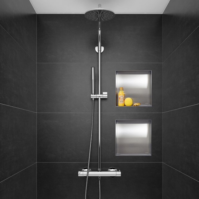 Półki wnękoweWALL-BOX No Rimpozwalają uporządkować przestrzeńw łazience inadają jej nowoczesnego designu. Na łatwo dostępnych półkach można ustawić kosmetyki, perfumy a w kabinie prysznicowej – szampony, żele i inne artykuły kąpielowe.