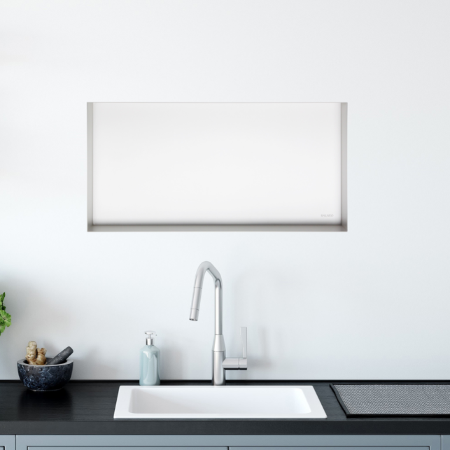 WALL-BOX No Rim można zamontować w większości ścian lub wnęk. Kołnierz otaczający WALL-BOX No Rimpozwala na przykrycie go np. płytkami, dzięki czemu półka będzieidealnie wkomponowywać sięw każdą ścianę.