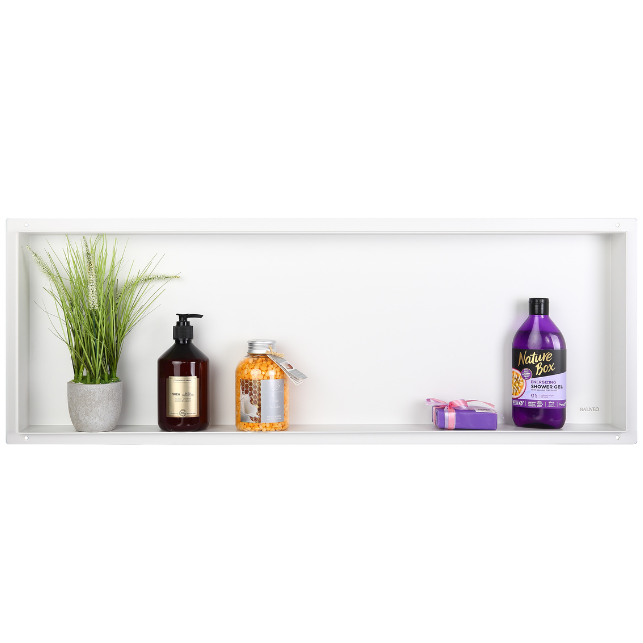 Półki wnękoweWALL-BOX No Rimpozwalają uporządkować przestrzeńw łazience inadają jej nowoczesnego designu. Na łatwo dostępnych półkach można ustawić kosmetyki, perfumy a w kabinie prysznicowej – szampony, żele i inne artykuły kąpielowe.
