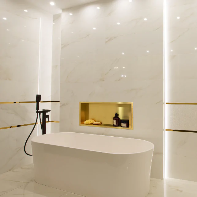 Półki wnękoweWALL-BOX No Rimpozwalają uporządkować przestrzeńw łazience inadają jej nowoczesnego designu. Na łatwo dostępnych półkach można ustawić kosmetyki, perfumy a w kabinie prysznicowej – szampony, żele i inne artykuły kąpielowe.