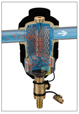 Zasada działania separatora zanieczyszczeń opiera się na połączeniu wielu zjawisk fizycznych. Wewnętrzny element (1) składa się z szeregu siatkowych powierzchni. Zanieczyszczenia zderzając się zpowierzchnię elementu wewnętrznego są separowane zwody iopadają do dolnej części korpusu (2), gdzie są gromadzone. Duża objętość wewnętrzna urządzenia powoduje zmniejszenie prędkości przepływającej wody, co wspomaga separację zanieczyszczeń. Usuwanie zgromadzonych zanieczyszczeń można przeprowadzić przy normalnej pracy instalacji, wtym celu należy otworzyć zawór (3) znajdujący się wdolnej części urządzenia. Kierunek przepływu nie ma wpływu na prawidłową pracę separatora zanieczyszczeń.