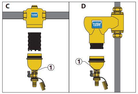 Aby przeprowadzić prace konserwacyjne (wwersji gwintowanej dla rur poziomych) (C) wystarczy odkręcić komorę zbierającą zanieczyszczenia za pomocą sześciokątnego klucza (26 mm). Wtej wersji możliwe jest usunięcie wewnętrznego elementu. Wprzypadku urządzeń dla rur pionowych (D) możliwe jest jedynie odkręcenie komory zbierającej zanieczyszczenia (element wewnętrzny nie może zostać usunięty).
