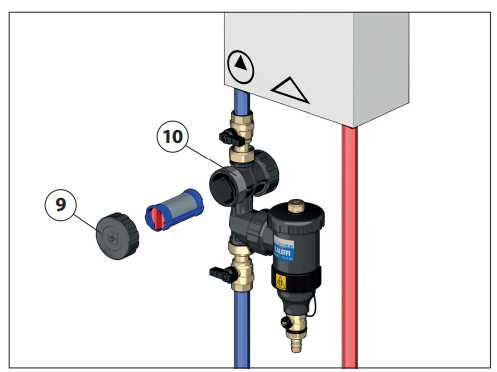 Urządzenie dostarczane jest zwkładem filtra (kolor niebieski) zstalową siatką omożliwości eliminacji cząstek ośrednicy większej niż 0,3 mm. Wkład jest wstanie usunąć wszystkie zanieczyszczenia podczas pierwszego uruchomienia. Po odcięciu iopróżnieniu urządzenia DIRTMAGPLUS filtr może zostać sprawdzony wnastępujący sposób: