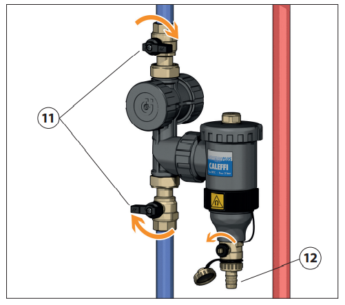 Urządzenie należy instalować zgodnie z kierunkiem przepływu oznaczonym strzałką, na rurociągu powrotnym przed źródłem ciepła/chłodu, najlepiej po stronie ssącej pompy. Korpus musi znajdować się w pozycji pionowej, skierowany śrubą odpowietrzającą ku górze.