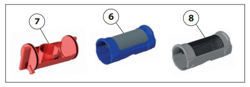 • wymienić wkład filtrujący na filtr koloru szarego (8) (opcjonalnie, kod F49474/GR – średnica oczka siatki 0,8 mm)