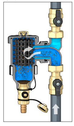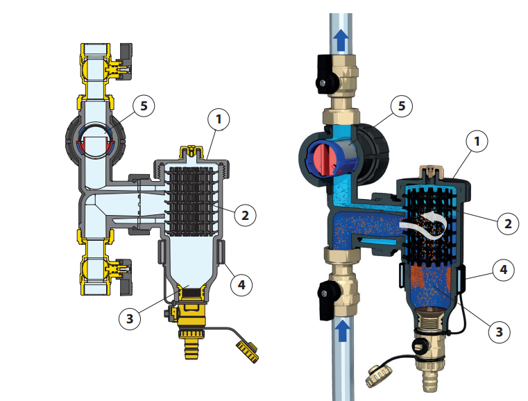 Zasada działania urządzenia opiera się na pracy dwóch niezależnych elementów. 1. Separatora zanieczyszczeń (1), który eliminuje zanieczyszczenia znajdujące się winstalacji. Wewnętrzny element (2) składa się z szeregu siatkowych powierzchni. Zanieczyszczenia zderzając się zpowierzchnią elementu wewnętrznego są separowane zwody iopadają do dolnej części korpusu (3), gdzie są gromadzone. Zanieczyszczenia ferromagnetyczne wychwytywane są za pomocą silnego pola magnetycznego wytwarzanego przez magnesy umieszczone wspecjalnym zewnętrznym pierścieniu (4). Duża objętość wewnętrzna urządzenia powoduje zmniejszenie prędkości przepływającej wody, co wspomaga separację zanieczyszczeń. 2. Filtra siatkowego (5) zwymiennym wkładem, który mechanicznie przechwytuje zanieczyszczenia znajdujące się wwodzie. Eliminacja cząstek realizowana jest przez wkład z siatką o ustalonej średnicy oczek.Woda obiegowa winstalacji wpierwszej kolejności przepływa przez separator zanieczyszczeń (1) anastępnie przez filtr siatkowy (5) zwymiennym wkładem. Podczas pierwszego uruchomienia separator zapewnia wysoki procent eliminacji cząstek nawet o najmniejszej wielkości. Filtr siatkowy usuwa wsposób mechaniczny 100% zanieczyszczeń owielkości większej niż średnica oczka siatki. Sprawność eliminacji zanieczyszczeń jest na maksymalnym poziomie już po kilku pełnych cyklach pracy instalacji.