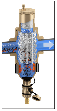 Separator powietrza-zanieczyszczeń wyposażony wmagnes pozwala zwysoką sprawnością na separację igromadzenie zanieczyszczeń ferromagnetycznych. Zanieczyszczenia tego typu wychwytywane są za pomocą silnego pola magnetycznego wytwarzanego przez magnesy umieszczone wspecjalnym zewnętrznym pierścieniu. Zewnętrzny pierścień może zostać zdjęty w celu usunięcia zgromadzonych osadów nawet podczas normalnej pracy instalacji. Ponieważ magnes został umieszczony na zewnątrz urządzenia nie ma on wpływu na jego charakterystykę hydrauliczną.