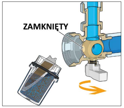 Specjalna konstrukcja pozwala w prosty sposób na sprawdzenie stanu zabrudzenia urządzenia. Po zamknięciu zaworu kulowego można odłączyć część odpowiedzialną za gromadzenie zanieczyszczeń i wyczyścić ją. Czyszczenie może być przeprowadzone pod bieżącą wodą.