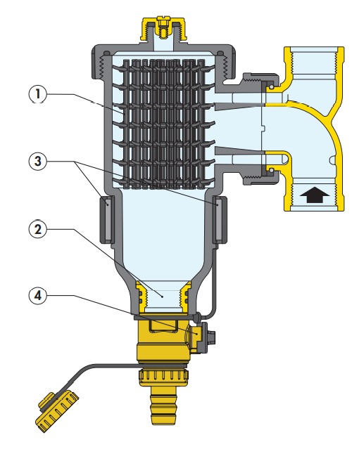 Zasada działania separatora zanieczyszczeń opiera się na połączeniu wielu zjawisk fizycznych. Wewnętrzny element (1) składa się z szeregu siatkowych powierzchni. Zanieczyszczenia zderzając się z powierzchnią elementu wewnętrznego są separowane z wody i opadają do dolnej części korpusu (2), gdzie są gromadzone. Zanieczyszczenia ferromagnetyczne wychwytywane są za pomocą silnego pola magnetycznego wytwarzanego przez magnesy umieszczone w specjalnym zewnętrznym pierścieniu (3). Duża objętość wewnętrzna urządzenia powoduje zmniejszenie prędkości przepływającej wody, co wspomaga separację zanieczyszczeń. Usuwanie zgromadzonych zanieczyszczeń można przeprowadzić przy normalnej pracy instalacji, w tym celu należy otworzyć zawór (4) znajdujący się w dolnej części urządzenia.