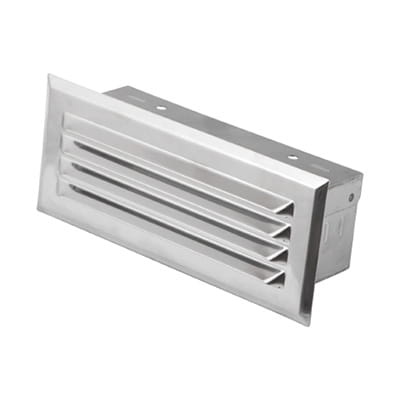 Element zapewniający dostęp świeżego powietrza z zewnątrz do kanałów prostokątnych o przekrojach 150 x 50 mm. Zastosowane poziome lamelki zabezpieczają przed deszczem oraz dostaniem się gryzoni.
