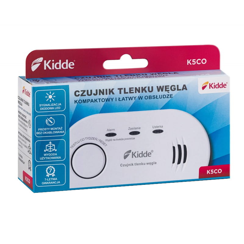 Czujnik tlenku węgla K5CO wyposażony w sensor elektrochemiczny Kidde, gwarantujący 10-letni okres pracy. Zasilanie bateryjne umożliwia zamontowanie detektora w optymalnym miejscu w pomieszczeniu oraz zapewnia ochronę także w przypadku zaniku napięcia zasilania w sieci.