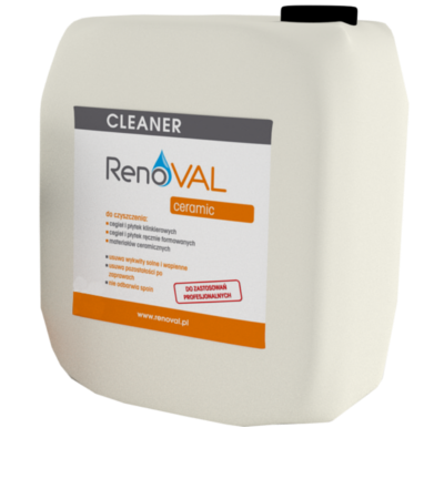 Renoval CleanerCeramicto specjalistyczny preparat (koncentrat) do usuwaniaz wszelkiego rodzaju nawierzchni ceramicznych, kamiennych wykwitów solnych i wapiennych, a także do usuwania pozostałości z klejów cementowych i zapraw murarskich, oraz typowych zabrudzeń użytkowych. Preparat można rozcieńczać wodą w takiej proporcji, jaka jest odpowiednia by środek nadal był skuteczny.