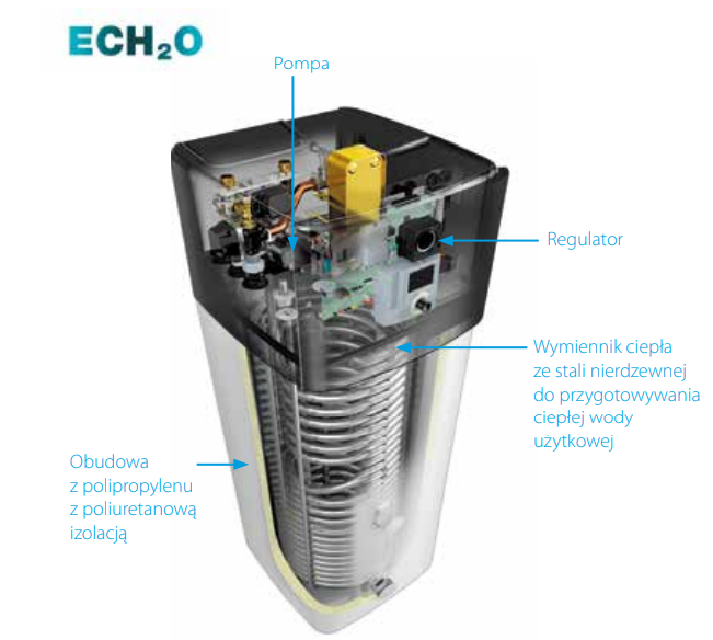 - Elektroniczne zarządzanie pompą ciepła i zbiornikiem buforowym ECH2O maksymalizuje efektywność energetyczną, zapewnia wygodne ogrzewanie i wytwarzanie ciepłej wody użytkowej