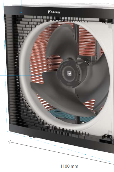 Inżynierowie Daikin wymienili dwa wentylatory na jeden większy izoptymalizowali jego kształt, aby obniżyć poziom głośności ipoprawić cyrkulację powietrza.