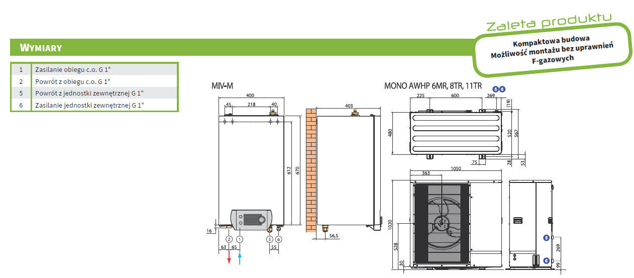 - Pompa ciepła powietrze/woda typu „monoblok” składa się z hermetycznej jednostki zewn. MONO AWHP i modułu wewnętrznego MIV-M