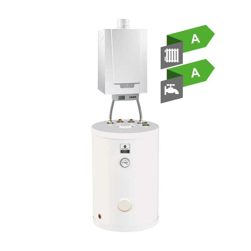 - Naścienny gazowy kocioł kondensacyjny wstępnie wyregulowany fabrycznie, w pakiecie z emaliowanym podgrzewaczem c.w.u. o pojemności 100 lub 150 litrów umieszczonym pod kotłem, chroniony antykorozyjnie anodą magnezową, podgrzewacz wyposażony w mufę do montażu grzałki elektrycznej