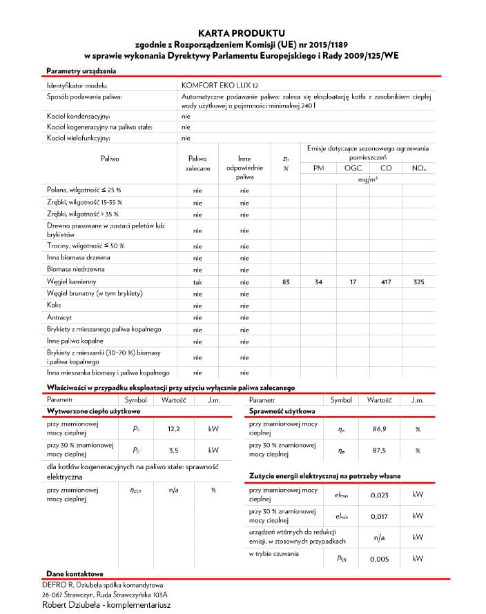 | Symbol producenta | KOMFORT EKO LUX 12KW |