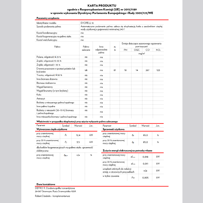 | Paliwo | – | pellet drzewny o średnicy 6 mm | ||