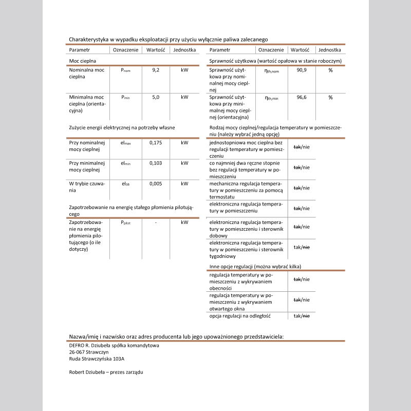 | Emisja CO (przy 13% O 2 ) | 0,018 |