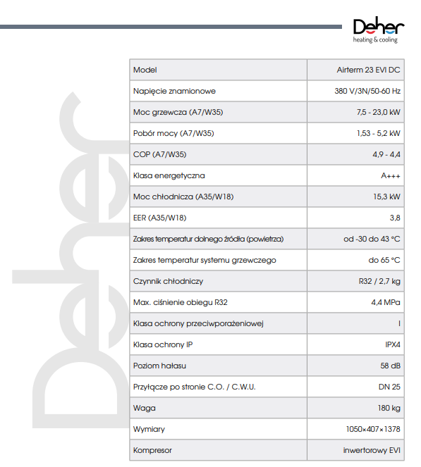 Urządzenie o największej mocy marki DEHER. Pompa ciepła powietrze-woda typu monoblok. Urządzenie odpowiadające na zwiększone zapotrzebowanie energetyczne w domach jednorodzinnych. Jak wszystkie pompy ciepła DEHER, korzysta z technologii EVI – bezpośredniego wtrysku pary do sprężarki Panasonic. Dzięki temu urządzenie jest niezwykle wydajne i zachowuje swoją sprawność nawet w niskich temperaturach do – 25 stopni Celsjusza. Pompa jest bezpieczna i łatwa w obsłudze. Ma szeroki zakres temperatur systemu grzewczego, nawet do 65 stopni Celsjusza. Dzięki swoim właściwościom doskonale sprawdza się w ogrzewaniu podłogowym, które potrzebuje niższej temperatury, ale także w systemie grzejnikowym, który z kolei wymaga wyższej temperatury zasilania. Dzięki zastosowanym sprężarkom inwerterowym urządzenie dopasowuje moc grzewczą oraz chłodniczą do aktualnego zapotrzebowania dla danego obiektu. Pompa DEHER AIRTERM 23 EVI DC jest idealnym rozwiązaniem zarówno do nowych jak i modernizowanych budynków. Charakteryzuje się wysokim współczynnikiem COP (~4,9) oraz dużą oszczędnością w klasie sezonowej efektywności energetycznej A+++. Dodatkowo, aby zaoszczędzić jeszcze więcej, można ją łączyć z fotowoltaiką oraz wykorzystać inteligentny system HEMS, który poprzez optymalizację zużycia energii zapewnia najwyższy poziom efektywności energetycznej.