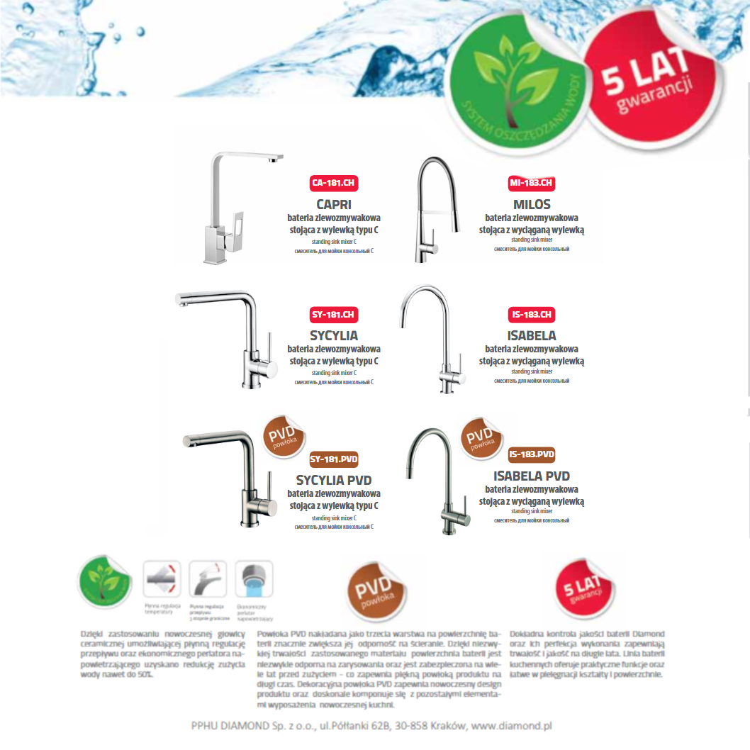 Perfekcja wykonania zapewnia trwałość ijakość na długie lata. Baterie kuchenne DIAMOND oferują praktyczne funkcje oraz łatwe wpielęgnacji kształty ipowierzchnie.