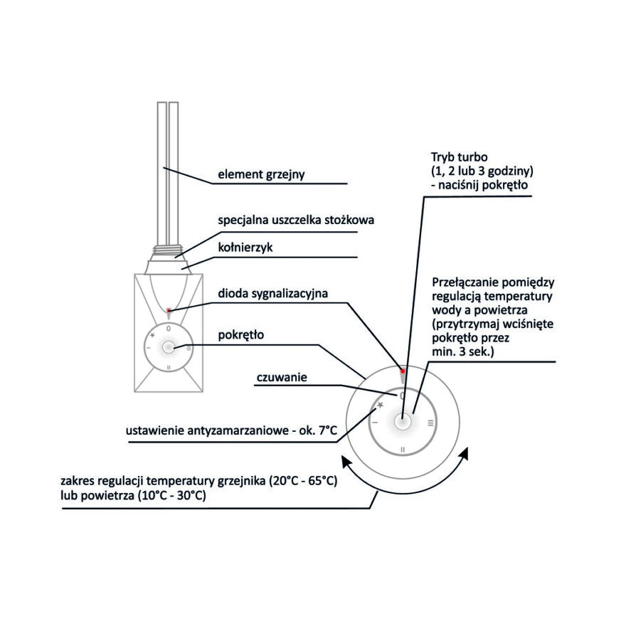 – Regulacja temperatury wody w grzejniku (w zakresie 0-65°C) lub temperatury powietrza w pomieszczeniu (w zakresie 0-30°C). Dzięki temu użytkownik ma możliwość regulacji temperatury wody w grzejniku lub temperatury powietrza w pomieszczeniu