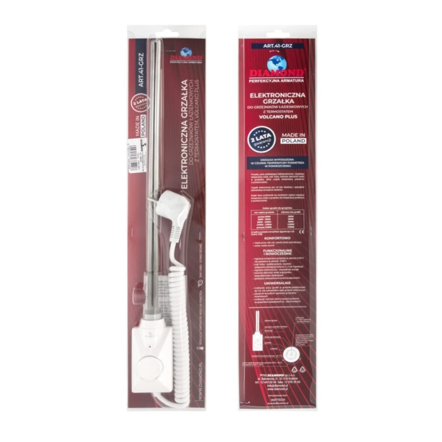 Grzałka elektryczna VOLCANO plus to model przeznaczony do grzejników łazienkowych oraz pokojowych (np. aluminiowych, kolumnowych lub żeliwnych). Jest to idealne rozwiązanie na suszenie ręczników czy dogrzewanie pomieszczeń w ciągu całego roku. Posiada regulację temperatury wody w grzejniku (w zakresie 0-65°C) lub temperatury powietrza w pomieszczeniu (w zakresie 0-30°C). Grzałka może być zamontowana w grzejniku podłączonym do C.O. jak i pracować samodzielnie (w grzejniku elektrycznym – niepodłączonym do C.O.). Czynnikiem grzewczym może być zarówno woda jak i miks woda/glikol. Posiada podłączenie elektryczne – przewód spiralowany z wtyczką Unischuko lub przewód prosty bez wtyczki (do podłączenia hard wire).