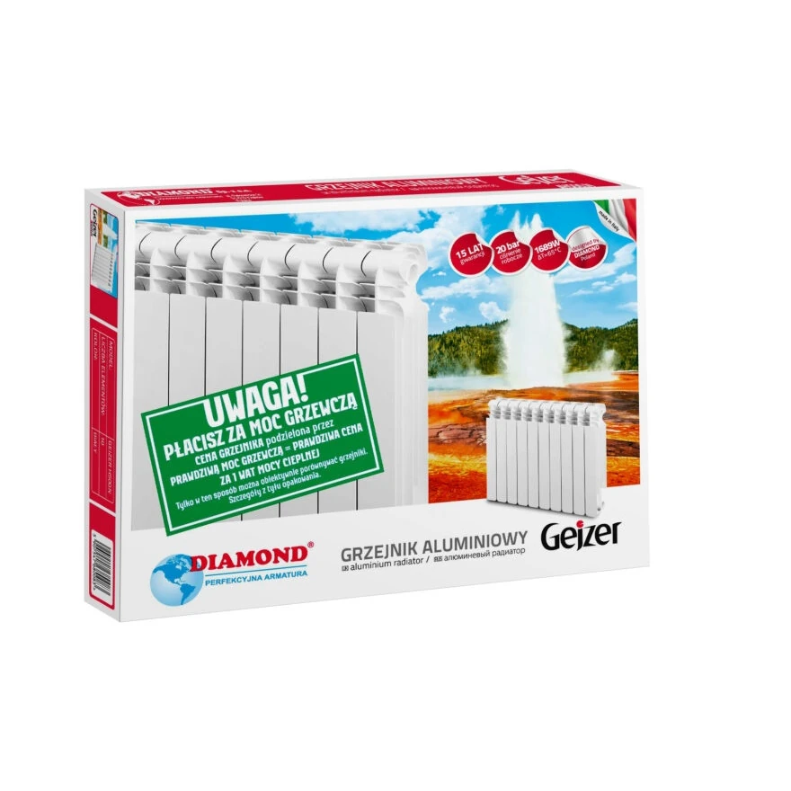 Grzejnik Gejzer to grzejnik aluminiowy przeznaczony do domowej instalacji grzewczej owysokiej wydajności. Charakteryzuje się mniejszą pojemnością wodną iwiększą powierzchnią grzewczą co zapewnia krótki czas nagrzania. Proces wykończenia polega na pokryciu pierwszą warstwą lakieru wprocesie anaforezy anastępnie polakierowany metodą elektrostatyczną przy użyciu proszku epoksydowo-poliestrowego (RAL 9016) iwypalony wpiecu.