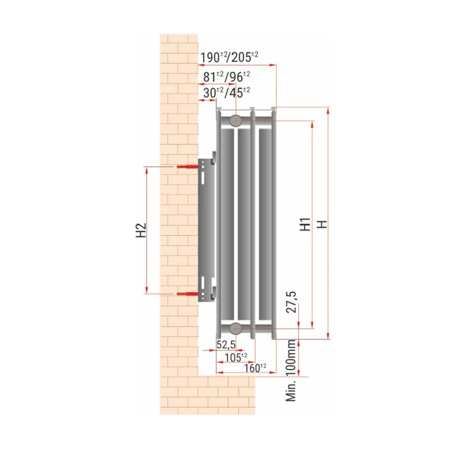 L2 – odległość od krawędzi grzejnika do środka zawieszki 2 (tylko dla grzejników L≥1600mm)