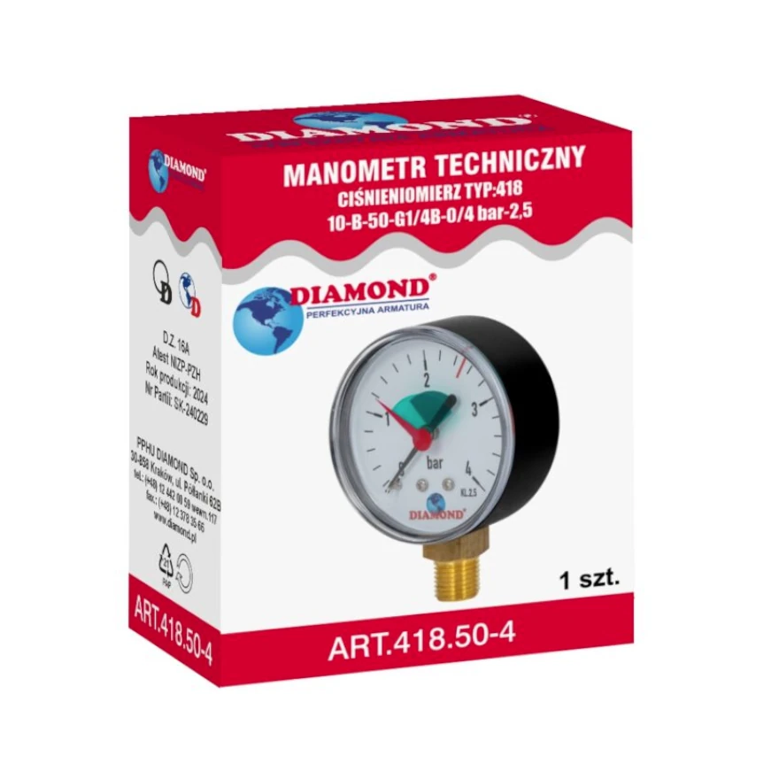| ART.418.50-4. | od 0 do 4 bar | 50 mm | G 1/4 Bpromieniowe | 2,5 |