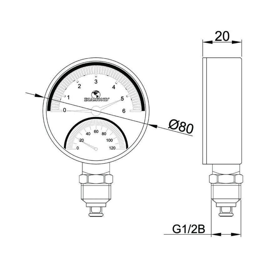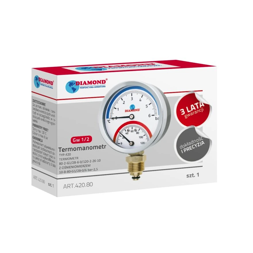 DIAMOND TERMOMANOMETR-TYP:420 TERMOMETR BM-80-2-G1/2B-6-0/120-2-26-10 +CIŚNIENIOMIERZ 10-B-80-G1/2B-2,5 – 0/6bar