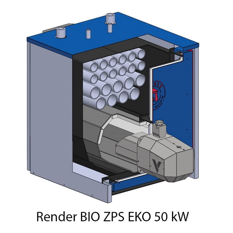 Kotły grzewcze typu bio ZPS EKO o mocach 50 – 150 kW są kotłami C.O. przeznaczonymi do spalania biomasy w postaci sprasowanego granulatu drzewnego – pelletów. Trzon kotła wykonano, jako konstrukcję spawaną z blachy kotłowej P265GH o grubości 6 mm. Wymiennik ciepła to prostopadłościan o podwójnych ścianach, podzielony przegrodami wodnymi. Kotły posiadają płomienicowo-płomieniówkowy wymiennik ciepła. Kocioł wyposażony jest w sterownik przystosowany do obsługi czterech pomp: C.O., C.W.U., cyrkulacyjnej i podłogowej.