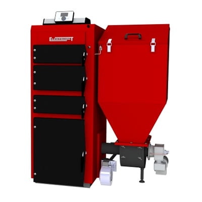 Kotły są konstrukcjami spawanymi z blachy stalowej o grubości 4 mm – korpus i o grubości 5 mm – wymiennik. Paliwo dostarczane jest do palnika za pomocą podajnika ślimakowego napędzanego motoreduktorem ze szczelnego zasobnika (pokrywa uszczelniona uszczelką) usytuowanego z prawej tzw. „kocioł prawy” lub lewej strony korpusu tzw. „kocioł lewy”.