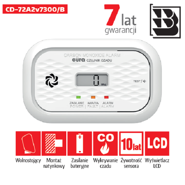 EURA-TECH CZUJNIK CZADU „EURA” CD-72A2v7300/B – DC 3V (2x LR6), LCD (certyfikat CNBOP-PiB ; 7 lata gwarancji, test 300 ppm)