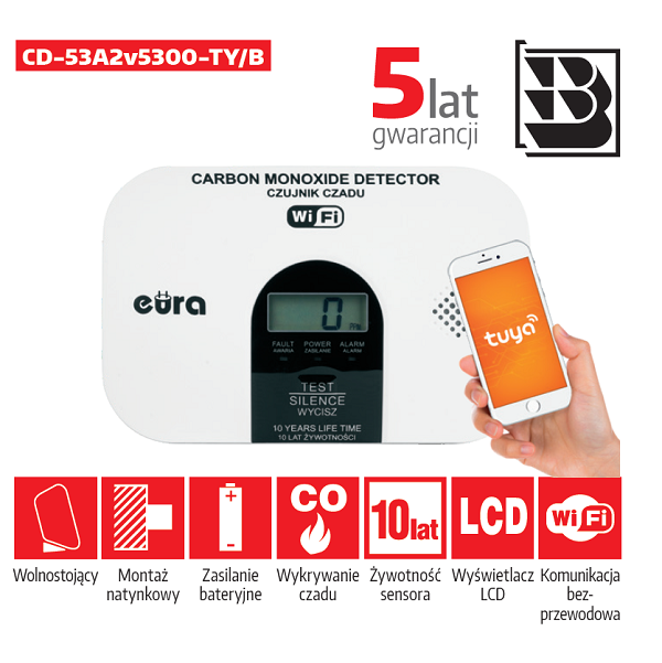EURA-TECH CZUJNIK CZADU WiFi „EURA” CD-53A2v5300-TY/B – DC 3V (2x LR6; LCD; 5 lat gwarancji; test 300 ppm; app Tuya)