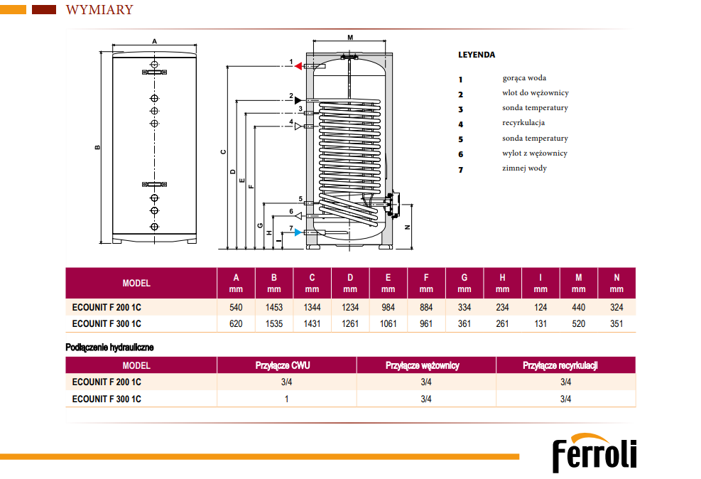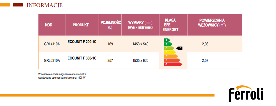 FERROLI ECOUNIT F 300-1 ZASOBNIK C.W.U. Z DUŻĄ WĘŻOWNICĄ SPIRALNĄ 2,57 M2 DO POMP CIEPŁA 300 L GRL6310A