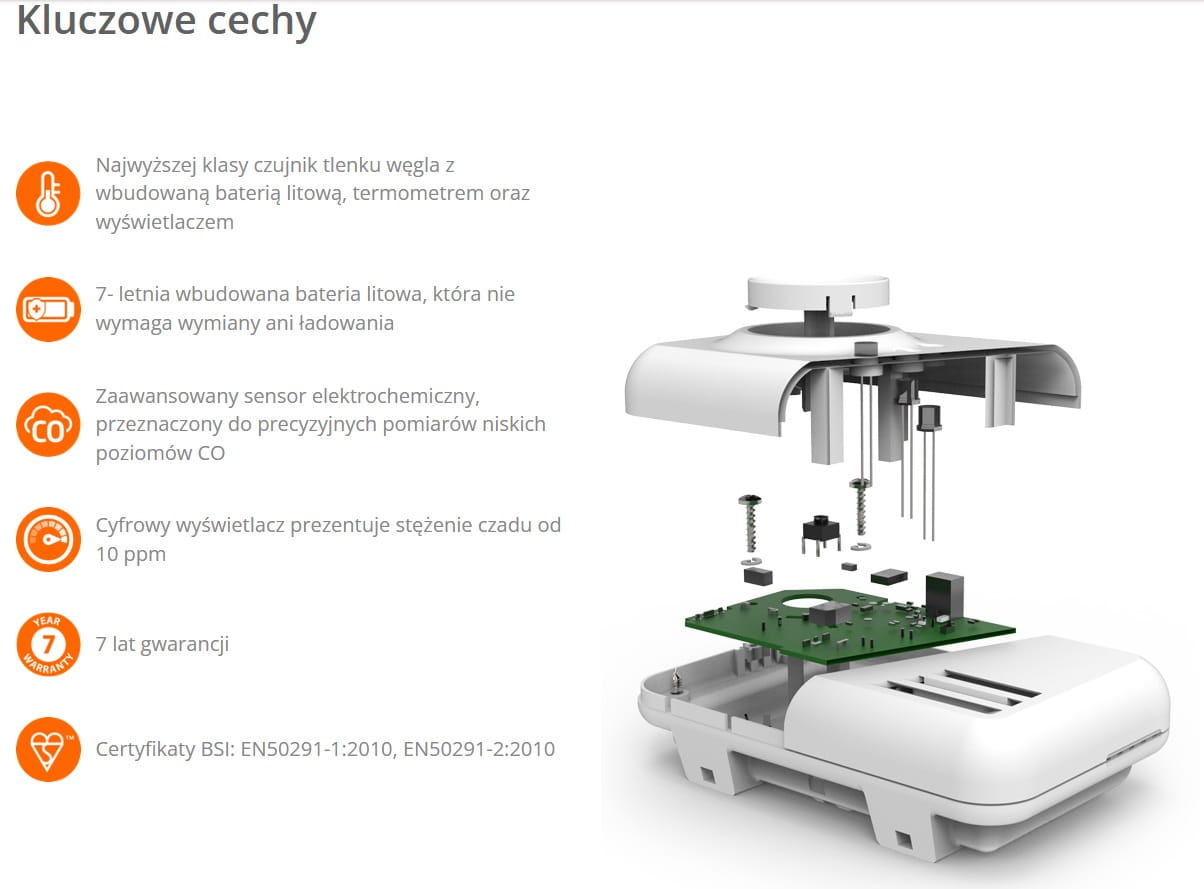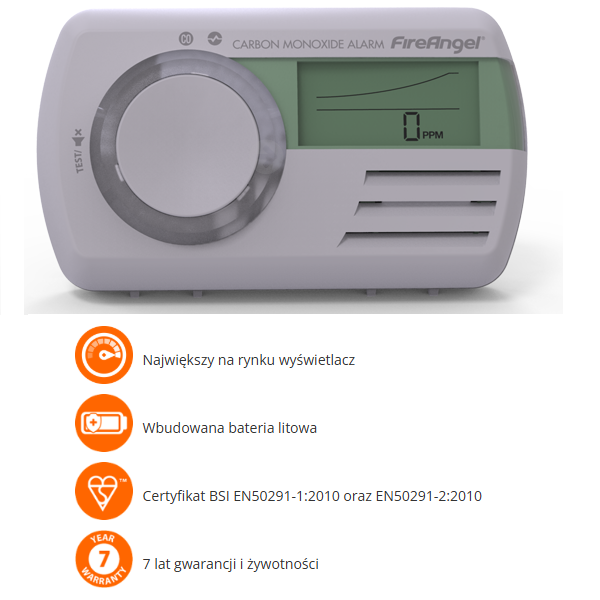 Czujniki tlenku węgla FireAngel to dziś najbardziej renomowane i certyfikowane czujniki dostępne na europejskim rynku. Opracowane i opatentowane rozwiązania przez zespół inżynierów w centrali firmy w Coventry w Anglii, pozwalają zapewnić użytkownikom czujników FireAngel najwyższy poziom bezpieczeństwa. Czujnik tlenku węgla (czadu) FireAngel CO-9D posiada komplet certyfikatów zgodności z normą EN50291-1 a także EN50291-2 wystawionych przez renomowane angielskie laboratorium BSI. Czujnik tlenku węgla (czadu) FireAngel CO-9D posiada największy na rynku cyfrowy wyświetlacz, który prezentuje stężenie tlenku węgla już od 10 ppm. Dzięki wbudowanej pamięci, użytkownik posiada możliwość odczytu najwyższej wartości tlenku węgla wykrytej w ciągu ostatnich czterech tygodni. Łatwość obsługi zapewnia wbudowana bateria litowa, która nie wymaga ładowania ani wymiany przez cały okres użytkowania. Urządzenie posiada wbudowany termometr. Dzięki niewielkim rozmiarom oraz certyfikatowi EN50291-2:2010, czujnik CO-9D idealnie znajdzie swoje zastosowanie, zarówno w typowych gospodarstwach domowych, jaki i w domkach wakacyjnych, przyczepach kempingowych czy też jachtach. Urządzenie posiada 7-letni okres gwarancji oraz żywotności.