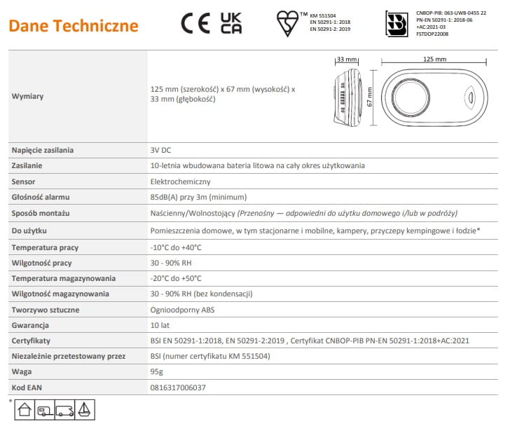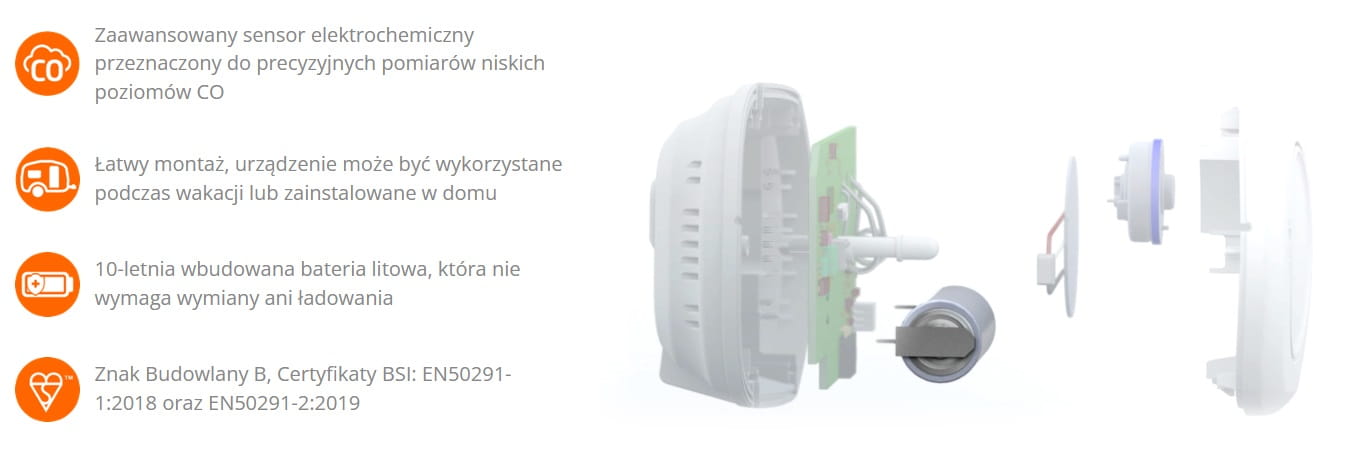 - Certyfikowany czujnik tlenku węgla, spełniający wymogi najnowszych przepisów
