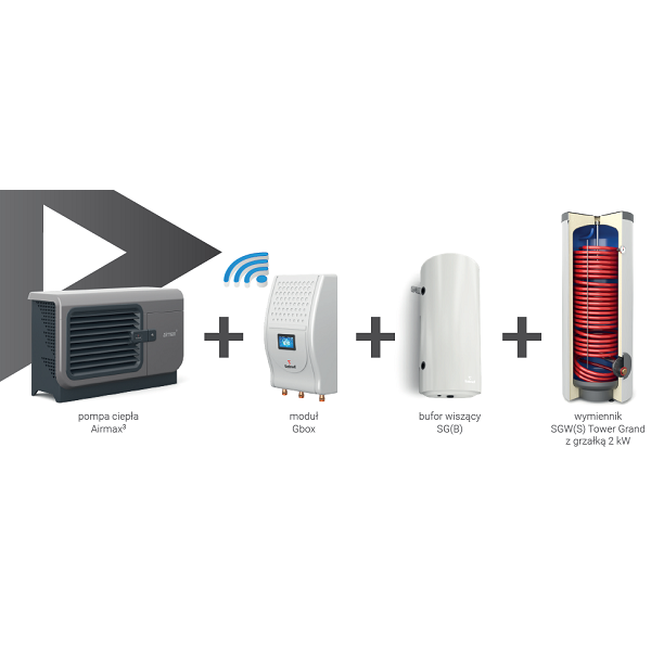 Hybrydowy System Grzewczy: pompa ciepła Airmax3 z modułem Gbox, buforem c.o. i wymiennikiem c.w.u. do pomp ciepła SGW(S) Tower Grand