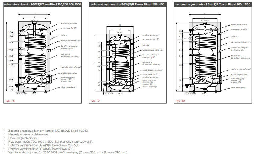 Odnawialna energia słoneczna stanowi źródło bezpłatnego i czystego ciepła dostępnego przez cały rok. Wykorzystywana do ogrzewania pozwala na znaczne obniżenie kosztów zapewnienia ciepłej wody użytkowej. Konstrukcja wymiennika Tower Biwal umożliwia maksymalne wykorzystanie tej czystej energii. Ciepło pozyskane przez kolektory słoneczne jest przekazywane do wody użytkowej poprzez dedykowaną do kolektorów słonecznych wężownicę spiralną. Umieszczenie jej w części dolnej zbiornika pozwoliło zapewnić pracę wymiennika z najwyższą wydajnością. Pracę dolnej wężownicy może wspierać, umieszczona nad nią, wężownica zasilana przez kocioł centralnego ogrzewania. Skraca to czas ogrzewania wody, szczególnie przy dużym zapotrzebowaniu na ciepłą wodę użytkową. Równolegle może też działać izolowany, elektryczny komplet grzejny GE lub zastaw grzałek na flanszy, instalowany w otworze rewizyjnym.
