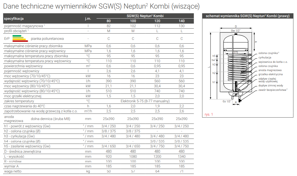 Neptun² Kombi, to wymiennik wiszący, o średnicy tylko 48 cm. Umożliwia wygodne połączenie wężownicy z kotłem c.o. z prawej lub lewej strony wymiennika, w zależności od modelu. Niewielka średnica sprawia, że bez problemu mieści się w każdej kotłowni. Wybór pojemności od 80 do 140 litrów czyni go uniwersalnym źródłem ciepłej wody użytkowej.