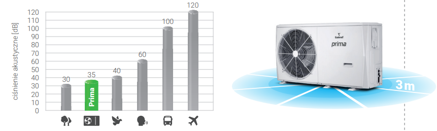 2 ciche programy pracy sprężarki i wentylatora. Ciśnienie akustyczne tylko 35 dB. Przykład dla modelu Prima 4GT, pomiar w odległości 3 m