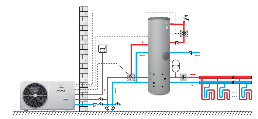 - System 4w1: pompa ciepła + wymiennik c.w.u. + bufor c.o. + zawór trójdrogowy.