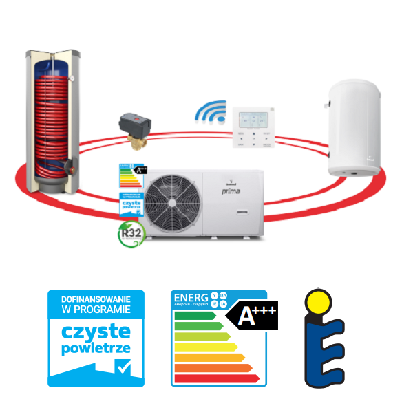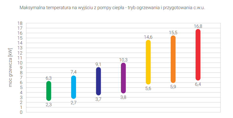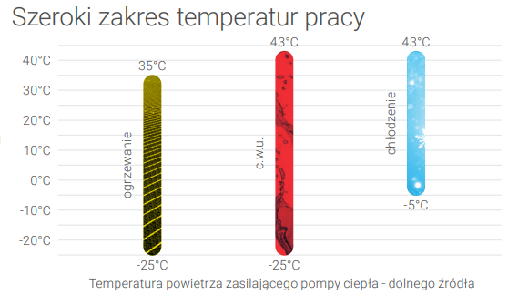- Temperatura na wyjściu z pompy ciepła do 65°C.