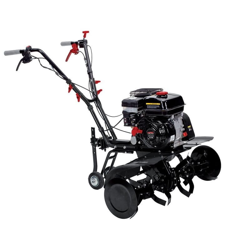 GLEBOGRYZARKA SPALINOWA TIP80-196-M Glebogryzarka NAC NAC TIP80-196-M wyposażona jest w górnozaworowy silnik o pojemności 196 cm 3 o maksymalnym momencie obrotowym 12,4 Nm charakteryzujący się bezawaryjnością i oszczędnością w spalaniu. Glebogryzarka posiada 2 koła podporowe ułatwiające pracę oraz przemieszczanie urządzenia. Dwa biegi: w przód oraz w tył, zapewniają łatwe prowadzenie oraz manewrowanie glebogryzarką. 24 mocne noże, które osadzone są na obrotowym wale, samoczynnie wgryzające się w glebę. zapewniają bardzo dobre efekty pracy. Urządzenie jest niezastąpione do spulchniania i wyrównania powierzchni gleby. Znajdzie zastosowanie się w nowo urządzanym ogrodzie lub przed założeniem trawnika. Doskonale sprawdzi się przy przygotowaniu gleby pod wysiew i sadzenie. Glebogryzarkę można również używać do: odchwaszczania, mieszania kompostu, torfu i nawozów z ziemią do wertykulacji i przycinania brzegów trawnika. Parametry : Model urządzenia – TIP 80-196-M Typ silnika – G 200-F Producent silnika – NAC Rodzaj silnika – czterosuwowy górnozaworowy OHV Pojemność silnika – 196 cm Moc znamionowa maszyny – 4.1 KW Maksymalna moc silnika – 6.5 KM Prędkość obrotowa silnika – 2500 obr/min Prędkość obrotowa zespołu napędowego – 150 obr/min Ilość biegów urządzenia – 2 ( do przodu oraz do tyłu ) Pojemność zbiornika paliwa – 3.8 litra Pojemność miski oleju – 0.6 litra Szerokość robocza – regulowana od 30 do 80 cm Paliwo – benzyna bezołowiowa Ilość noży – 24 sztuki Ilość sekcji roboczych – 6 sztuk Średnica sekcji tnących – 32 cm Ilość kół podporowych – 2 sztuki Obudowa – stalowa Waga urządzenia – 61 kg Producent urządzenia – NAC