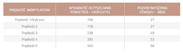 | Wydajność w oczyszczaniu powietrza z pyłu, kurzu i dymu - CADR (m3/h) | 350 |