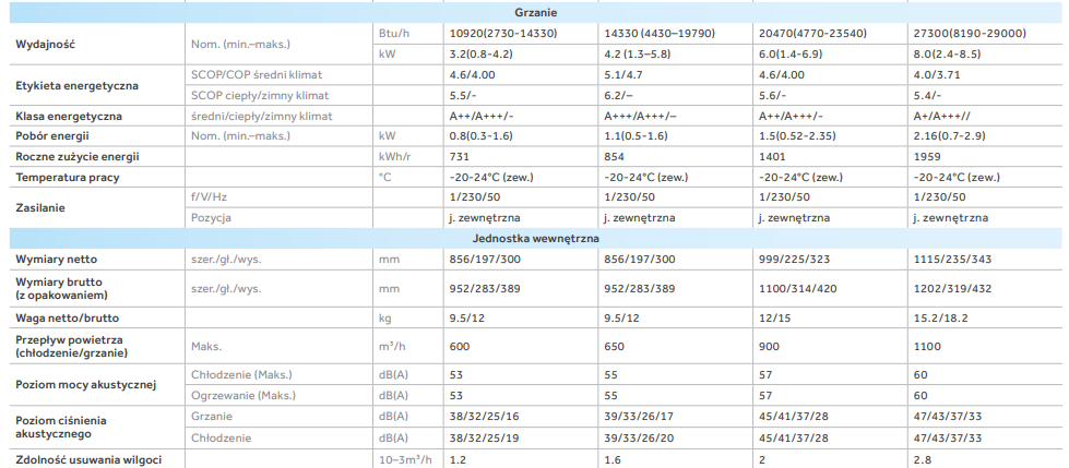 | Poziom ciśnienia akustycznego jednostki wewnętrznej dla chłodzenia min./maks. (dBA) | 33 / 47 |