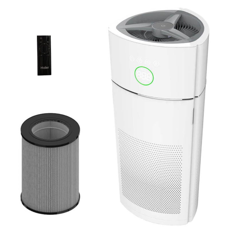 Oczyszczacz powietrza Haier to inteligentne rozwiązanie dla zdrowego i czystego powietrza w Twoim domu lub biurze. Wyróżnia się bardzo wysoką skutecznością oczyszczania ze wskaźnikiem CADR 500 m³/h, dokładnym monitorowaniem jakości powietrza i przyjaznym sterowaniem. Zastosowanie Filtra 3w1 pozwala na efektywne usuwanie włosów, sierści, kurzu, płynu i dymu, a także na pozbycie się trujących substancji znajdujących się w powietrzu, tj. formaldehyd, benzen, amoniak, czy nikotyna. Oczyszczacz powietrza marki Haier posiada zwartą i kompaktową konstrukcję, która pozwoli umiejscowić go w dogodnej dla użytkownika przestrzeni. w zestawie z urządzeniem znajduje się bezprzewodowy pilot.