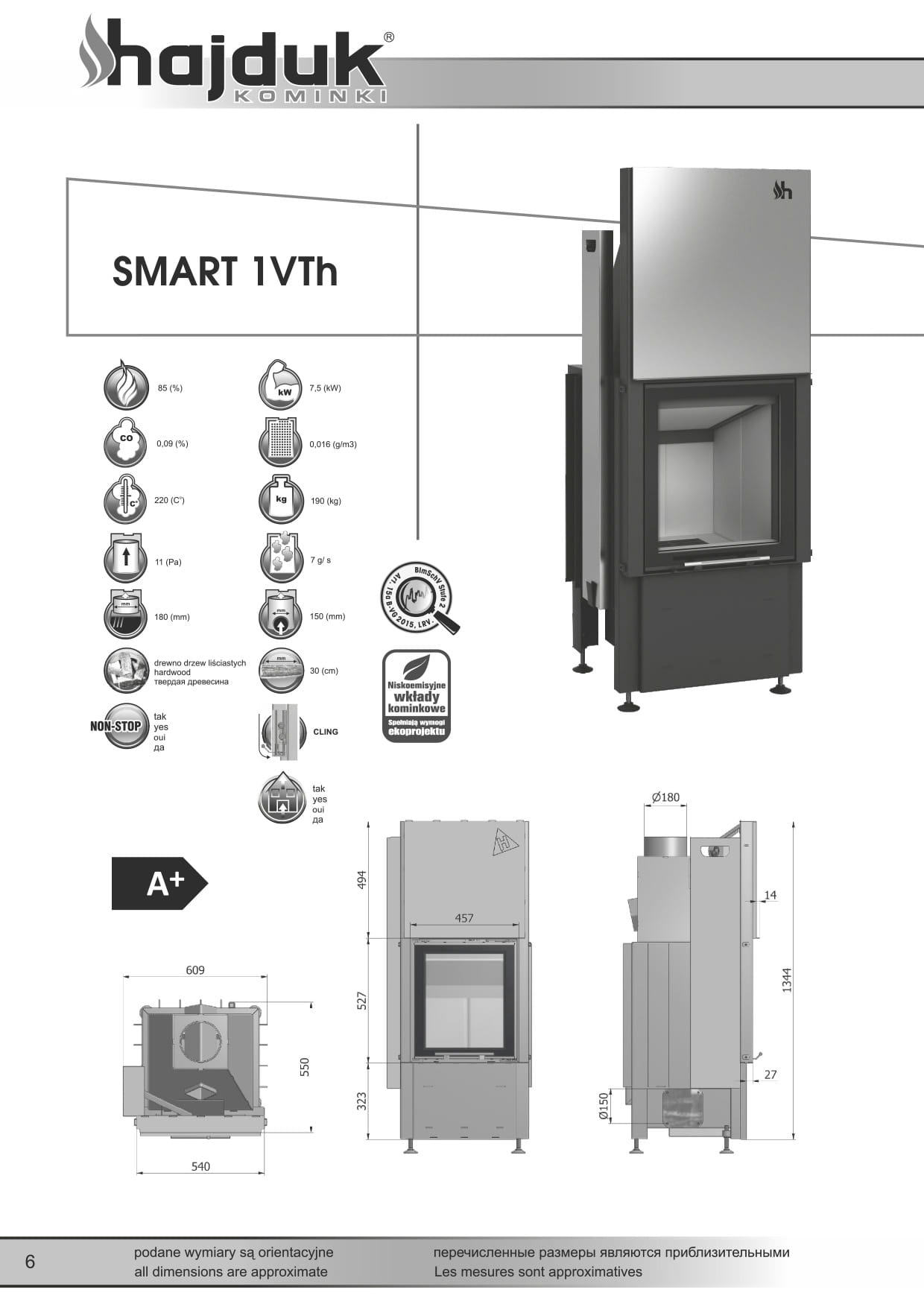 - Deklaracje zgodności z Ekoprojektem, Europejską Normą EN 13229, zaostrzeniem BImSchV próg drugi wymagany od 2015 roku dla Niemiec, art.15A dla Austrii próg od 2015 oraz LRV dla Szwajcarii.