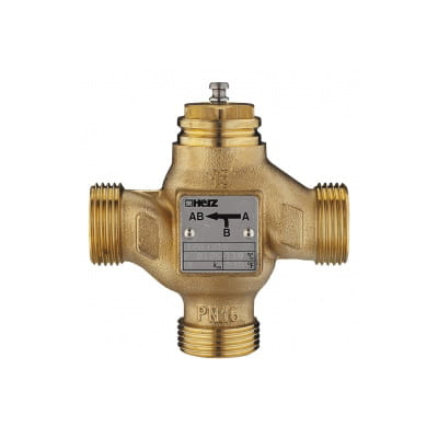 Zawór 3-drogowy mieszający i rozdzielający do regulacji w instalacjach wody zimnej i gorącej. Z napędem 1 7712 działa jako regulator nastawczy z możliwością wyboru charakterystyki zaworu. Trzpień ze stali nierdzewnej, grzybek zaworu z mosiądzu ze wzmocnionym uszczelnieniem teflonowym. Dławnica z mosiądzu z O-ringiem EPDM. Montaż w dowolnej pozycji pionowej lub poziomej. Korpus w wykonaniu żółtym z odlewu mosiężnego z trzema gwintami zewnętrznymi, uszczelnienie płaskie, bez śrubunków przyłączeniowych.